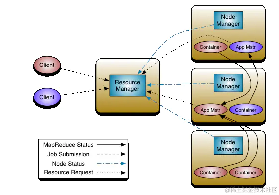 Yarn的框架也是经典的主从结构,和HDFS的一样,大体上yarn由一个ResourceManager和多个NodeManager构成,RM为主节点,NM为从节点。