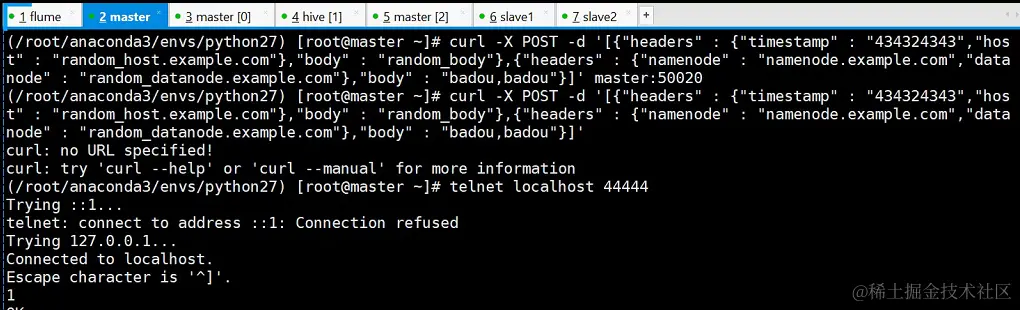 curl -X POST -d '[{"headers" : {"timestamp" : "434324343","host" : "random_host.example.com"},"body" : "random_body"},{"headers" : {"namenode" : "namenode.example.com","datanode" : "random_datanode.example.com"},"body" : "badou,badou"}]' master:50020