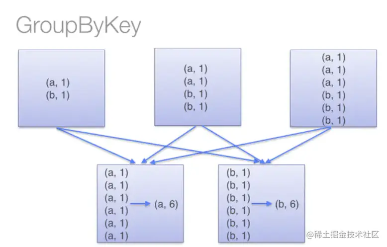 groupByKey 算子操作发生在动作操作端,即 Shuffle 之后,所以势必会将所有的数据通过网络进行传输,造成不必要的浪费。同时如果数据量十分大,可能还会造成 OutOfMemoryError。如下图所示: