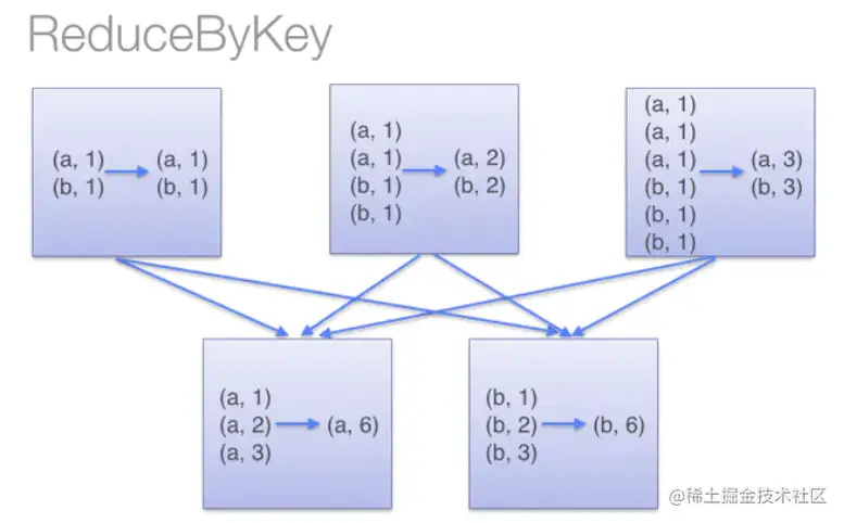 reduceByKey()会在 shuffle 之前对数据进行合并。有点类似于在 MapReduce 中的 combiner。这样做的好处在于,在转换操作时就已经对数据进行了一次聚合操作,从而减小数据传输。如下图所示: