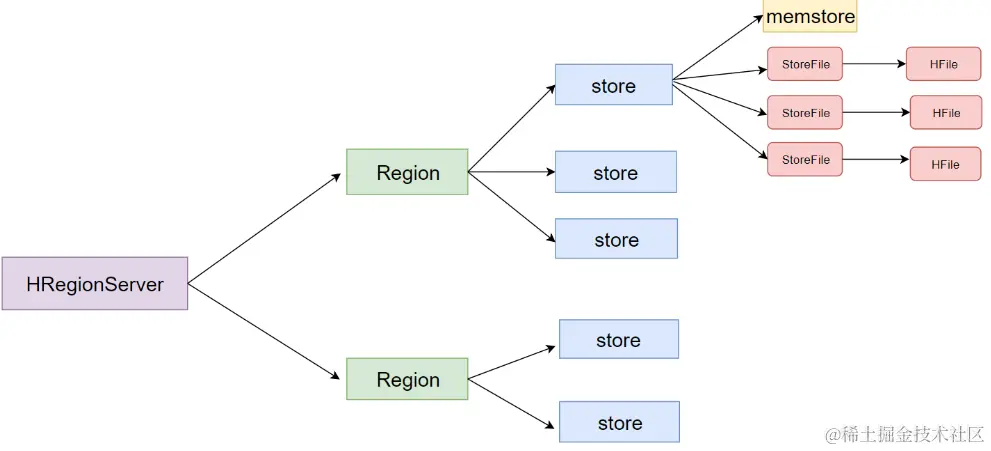 - HRegionServer里面有很多的HRegion,HRegion里面有很多的HStore组成,HStore是Hbase核心的存储单元