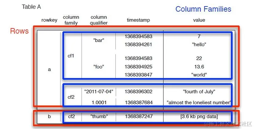- HBase 是一个面向列的数据库,在表中它由行排序。表模式定义只能列族,也就是键值对。一个表有多个列族以及每一个列族可以有任意数量的列。后续列的值连续地存储在磁盘上。表中的每个单元格值都具有时间戳。总之,在一个 HBase:表是行的集合、行是列族的集合、列族是列的集合、列是键值对的集合。