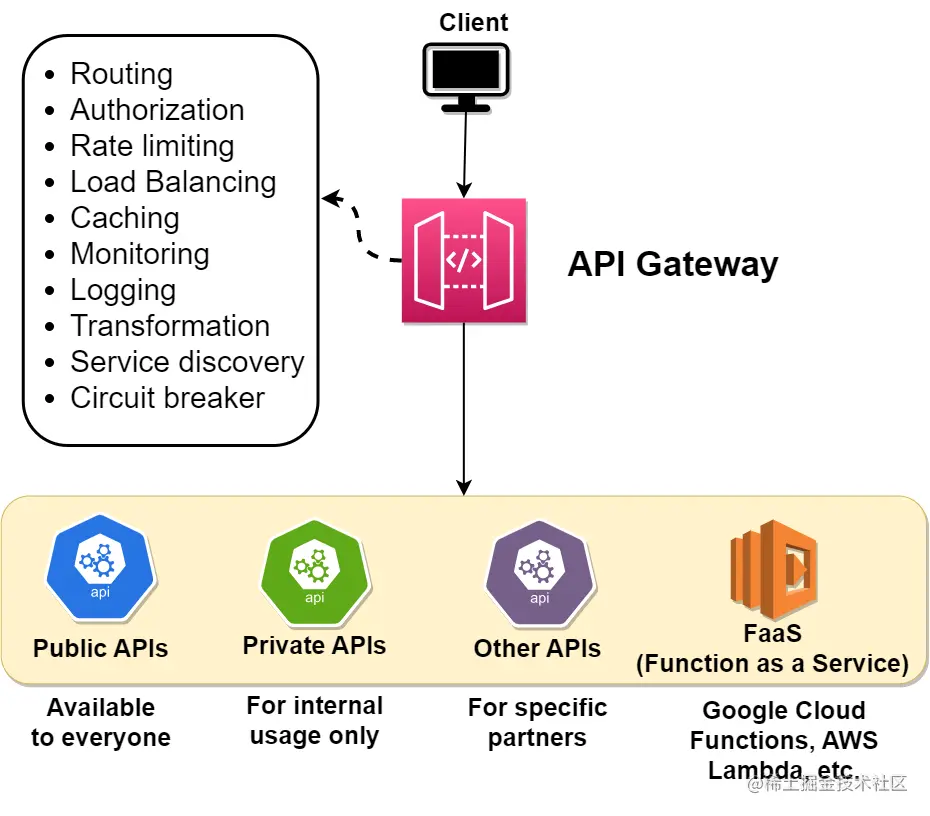 - 缓存:为了最小化延迟和后端负载,API网关会缓存经常使用的响应,并直接服务于客户端,无需查询后端服务。