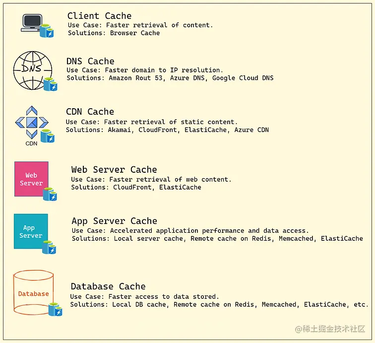缓存是位于应用程序和原始数据源(如数据库、文件系统或远程网络服务)之间的高速存储层。当应用程序请求数据时,首先检查缓存。如果数据存在于缓存中,它就会被返回给应用程序。如果在缓存中找不到数据,那么数据就会从原始源获取,存储在缓存中以备将来使用,然后返回给应用程序。在分布式系统中,缓存可以出现在多个位置,包括客户端、DNS、CDN、负载均衡器、API网关、服务器、数据库等。