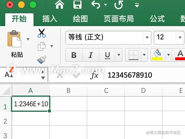 在单元格中输入的数字是12345678910,此时输入的数字共计11位,可以看到单元格中出现了E+格式,如下图: