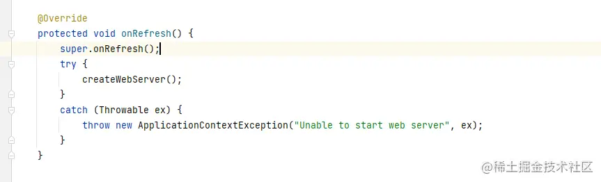 我们可以看出会调用onRefresh()方法,因为AbstractApplicationContext使用的是模板方法模式,具体的实现交给子类实现,因为使用的是Tomcat,所以交给了ServletWebServerApplicationContext类来实现,具体的子类里面有一个createWebServer()方法,它就是创建Web容器。