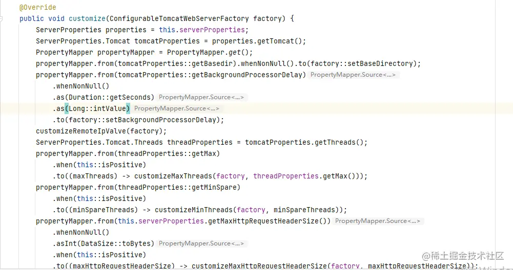 我们回到TomcatWebServerFactoryCustomizer类中,SpringBoot使用了它的PropertyMapper类对属性进行设置,我们可以看出它使用propertyMapper.from().to()语法,其实就是将ServerProperties中的属性设置到ConfigurableTomcatWebServerFactory中,这个属性设置是在Spring对Bean进行初始化时候设置的,使用的是Spring的后置处理器来实现的,后面我们继续说。
