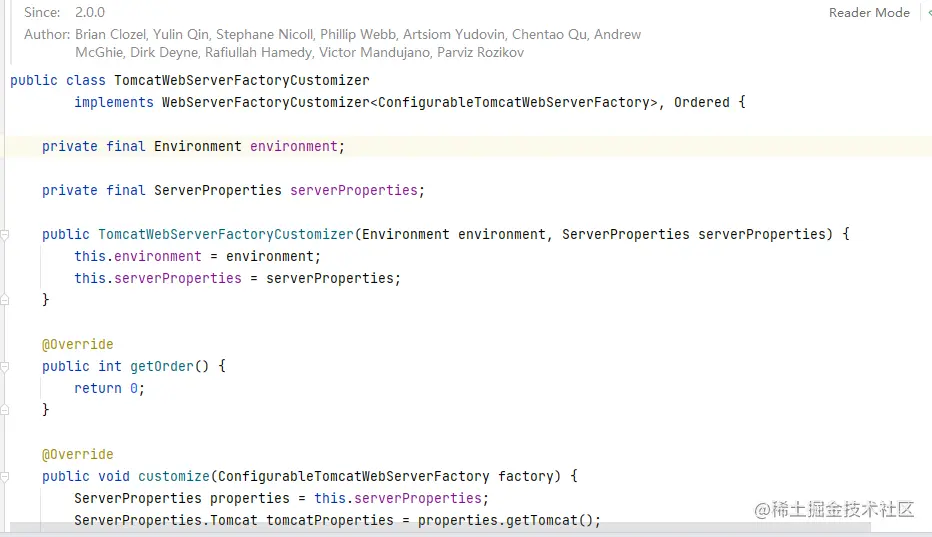 因为我们使用的是Tomcat,那么就选择一个Tomcat相关的类,我们选择TomcatWebServerFactoryCustomizer,这个类实现了接口WebServerFactoryCustomizer,并实现了方法customize。