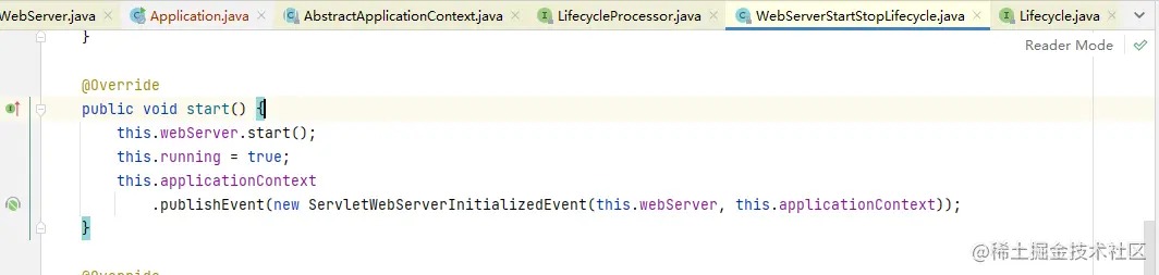 最终会走到WebServerStartStopLifecycle这个生命周期,这里就会调用WebServer中的start()方法。