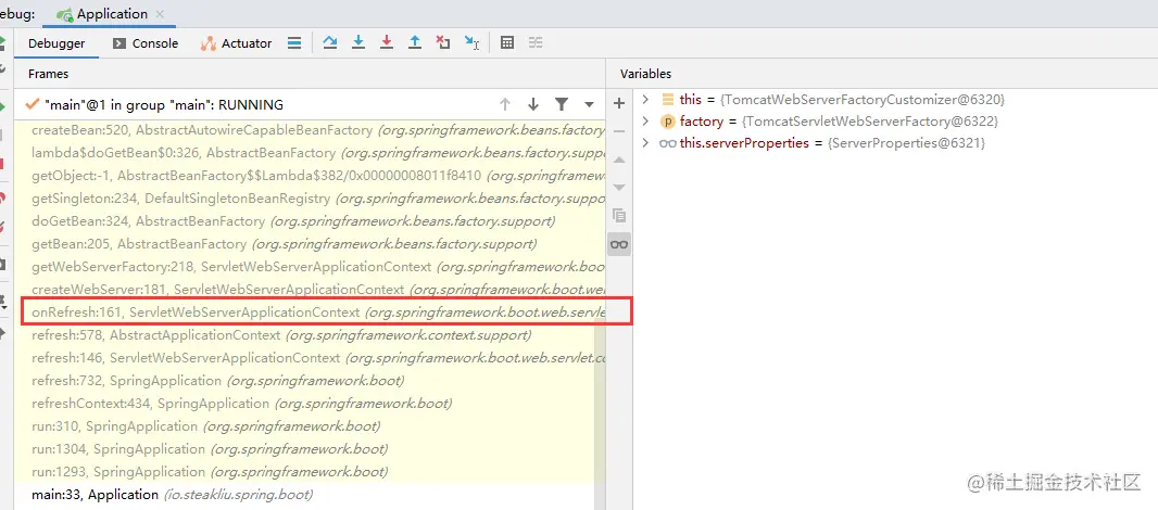 我们在上面的TomcatWebServerFactoryCustomizer类中的customize方法中打一个断点,然后debug,于是得到调用链如下。