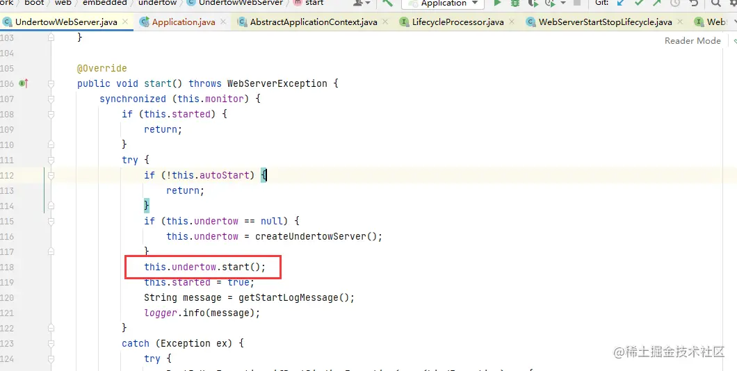 上面我们介绍了Tomcat容器的创建,Undertow的流程和Tomcat基本上是一样的,但是在启动的时候,Undertow是在start()方法中启动,而start()方法需要在 finishRefresh()这一步中执行。