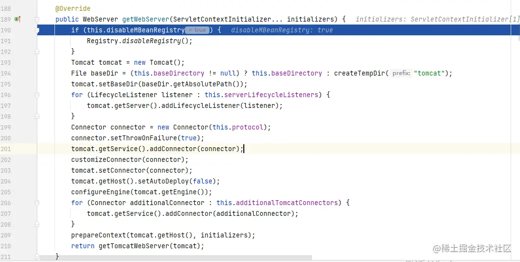 获取到WebServerFactory后,就可以创建Web容器,因为使用的是Tomcat,所以使用的是TomcatServletWebServerFactory,如下,我们就看到了Tomcat的身影。