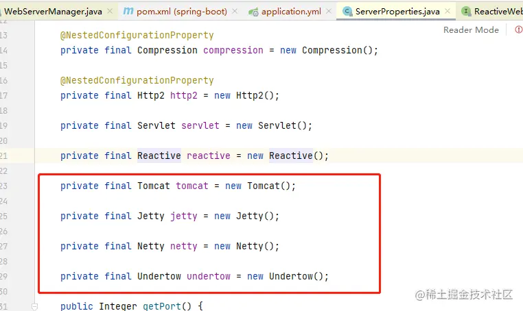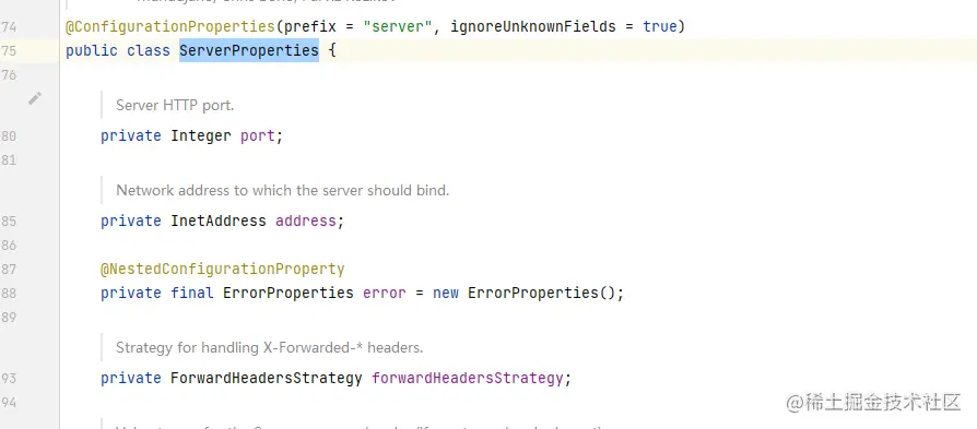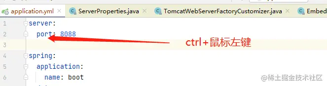 那么这里就是一个入口,在SpringBoot中,我们要获取yml文件中的配置信息,一般是通过@ConfigurationProperties注解,我们可以按住ctrl,然后鼠标点击这个port,就能跳到对应的属性类里面。