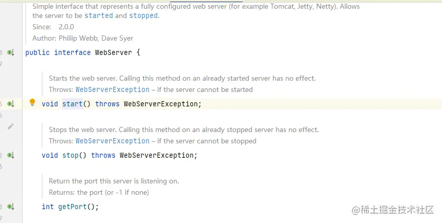 不过对于start()和stop(),它们只是接口抽象的规范,在具体的实现中,也并不是全部都按照这个标准,start()方法上有备注Starts the web server. Calling this method on an already started server has no effect.,翻译为:启动web服务器。在已启动的服务器上调用此方法无效。,比如Tomcat的就没有在start()方法中启动服务器,具体我们等会会看。