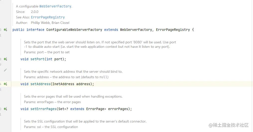 customize的参数是ConfigurableTomcatWebServerFactory,它是一个接口,它还继承了接口ConfigurableWebServerFactory,我们从ConfigurableWebServerFactory中看出里面有设置端口,地址等方法。