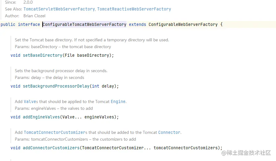 我们再回头看ConfigurableTomcatWebServerFactory,可以看出里面是一些Tomcat相关的方法。