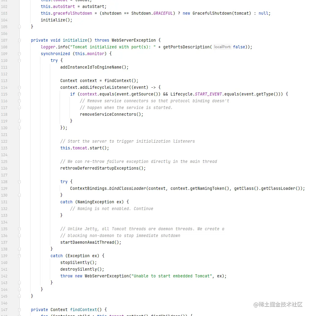 最后启动Tomcat容器是在TomcatWebServer中,在TomcatWebServer的构造函数中调用initialize(),在initialize()中我们看是this.tomcat.start(),Tomcat被启动了。