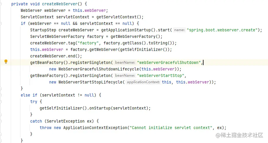 经过一系列处理后,就从IOC容器中获取到了WebServerFactoryBean,然后再使用这个工厂去创建Web服务。