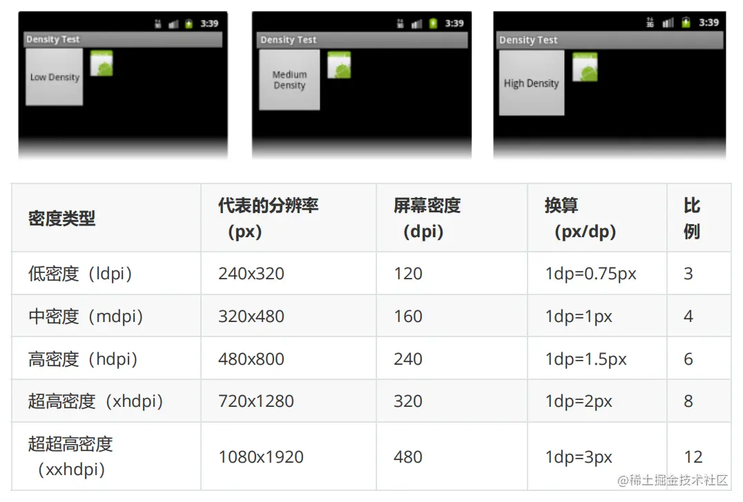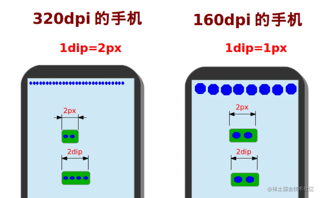 假设有一部手机,屏幕的物理尺寸为1.5英寸x2英寸,屏幕分辨率为240x320,则我们可以计算出在这部手机的屏幕上,每英寸包含的像素点的数量为240/1.5=160dpi(横向)或320/2=160dpi(纵向),160dpi就是这部手机的像素密度,像素密度的单位dpi是Dots Per Inch的缩写,即每英寸像素数量.