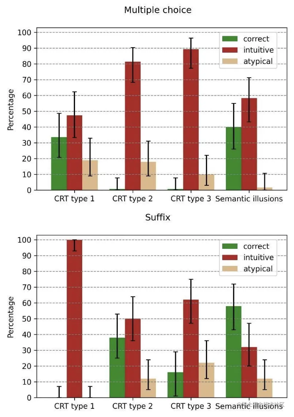 作者采用了CRT(Cognitive Reflection Test)数据作为脑筋急转弯的测试数据。该数据在心理学领域,广泛地被用于衡量人类的思维习惯,判断是否习惯于直觉思维。