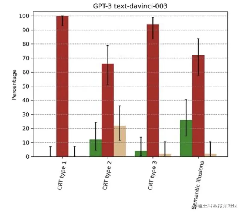 模型表现如下图所示,可以看到模型较小时(从117M GPT-1 到2.7B GPT-Neo),随着模型增大,模型回答正确答案(绿色)和直觉答案(红色)的比例在提高,回答无关答案(黄色)的比例在下降。但随着模型进一步增大(从2.7B GPT-Neo 到 175B GPT-3),无关答案比例进一步下降,直觉答案比例进一步上升,正确答案比例却不升反降。包括BLOOM、LLAMA、GPT-3在内的大语言模型明显掉入脑筋急转弯的陷阱。即使是经过指令调整与RLHF的text davinci-002/003也未能幸免。