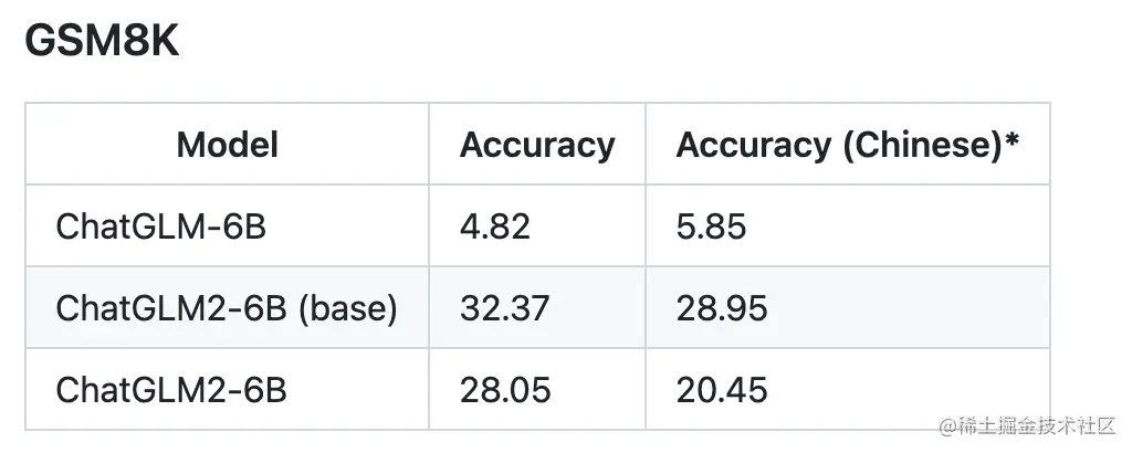 我们选取了部分中英文典型数据集进行了评测,以下为 ChatGLM2-6B 模型在 MMLU (英文)、C-Eval(中文)、GSM8K(数学)、BBH(英文) 上的测评结果。