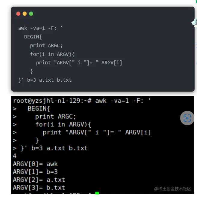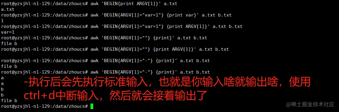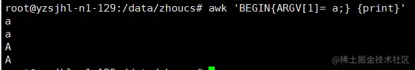 - awk处理玩一个文件后,就会从从ARGV的下一个元素获取参数,如果是一个文件则继续处理,如果是一个变量赋值则执行赋值操作