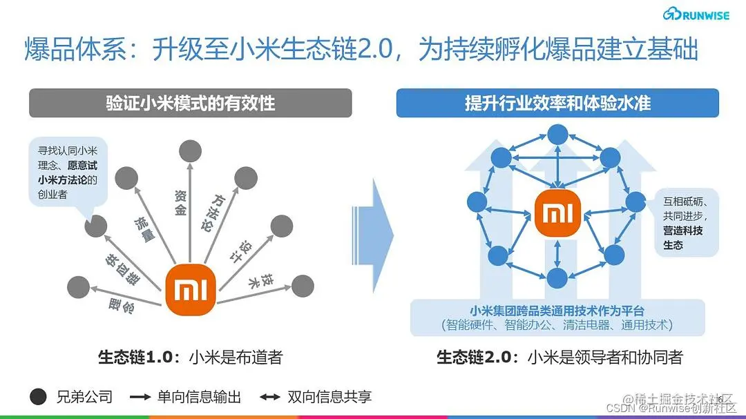 在生态链1.0的拓荒时代,小米生态链的主要目标是寻找认同小米理念、愿意试小米方法论的创业者,帮他们组建团队并给予扶持,小米更偏向于作为一个理念、模式、能力、资源的输出者;而在生态链2.0时代,小米生态链更要和兄弟公司互相砥砺、共同进步,营造科技生态,抬升行业的新上限,小米的角色更偏向于一个与生态链企业并肩探索的领头者和生态维护的协同者。