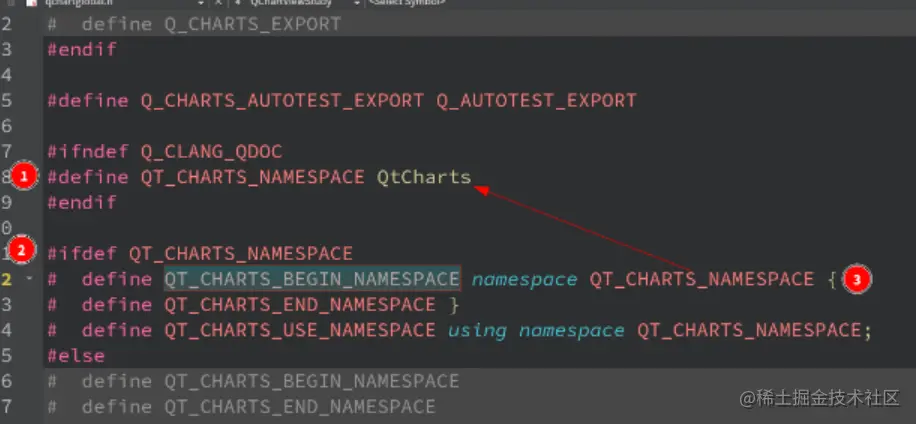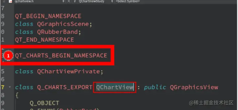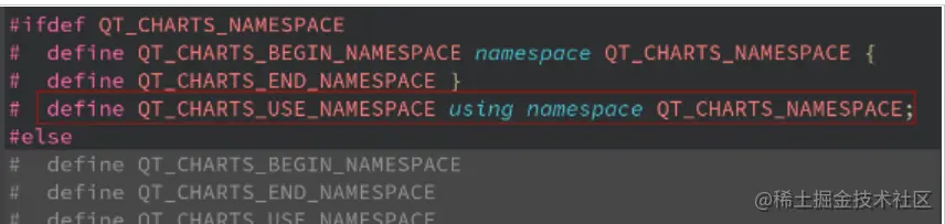 大概理解或者猜一下,开始一个命名空间?点击进去我们再看看这个QT_CHARTS_BEGIN_NAMESPACE是个什么?