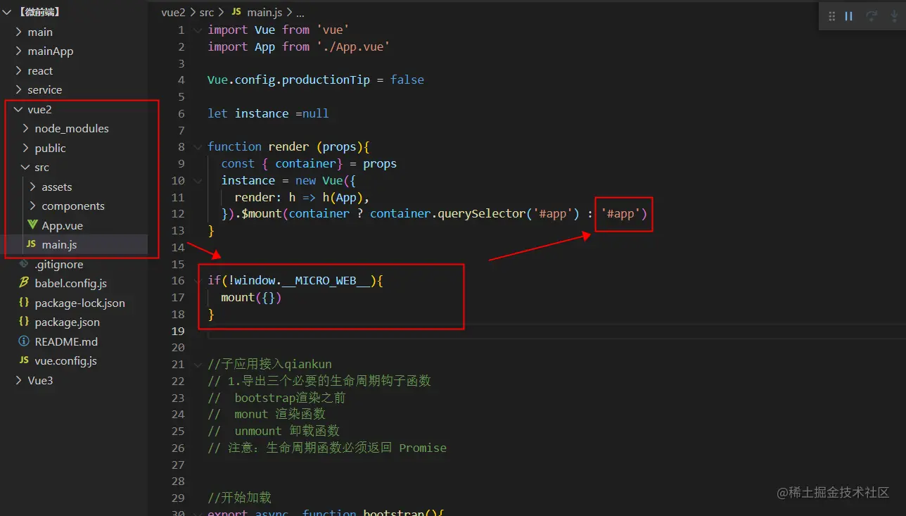 对获取到的生命周期函数信息,我们可以将其绑定在我们的配置列表app里,然后使用app.mount 对这个生命周期函数进行调用即可。为了便于函数逻辑的添加,我们可以把生命周期函数的调用都封装成函数。