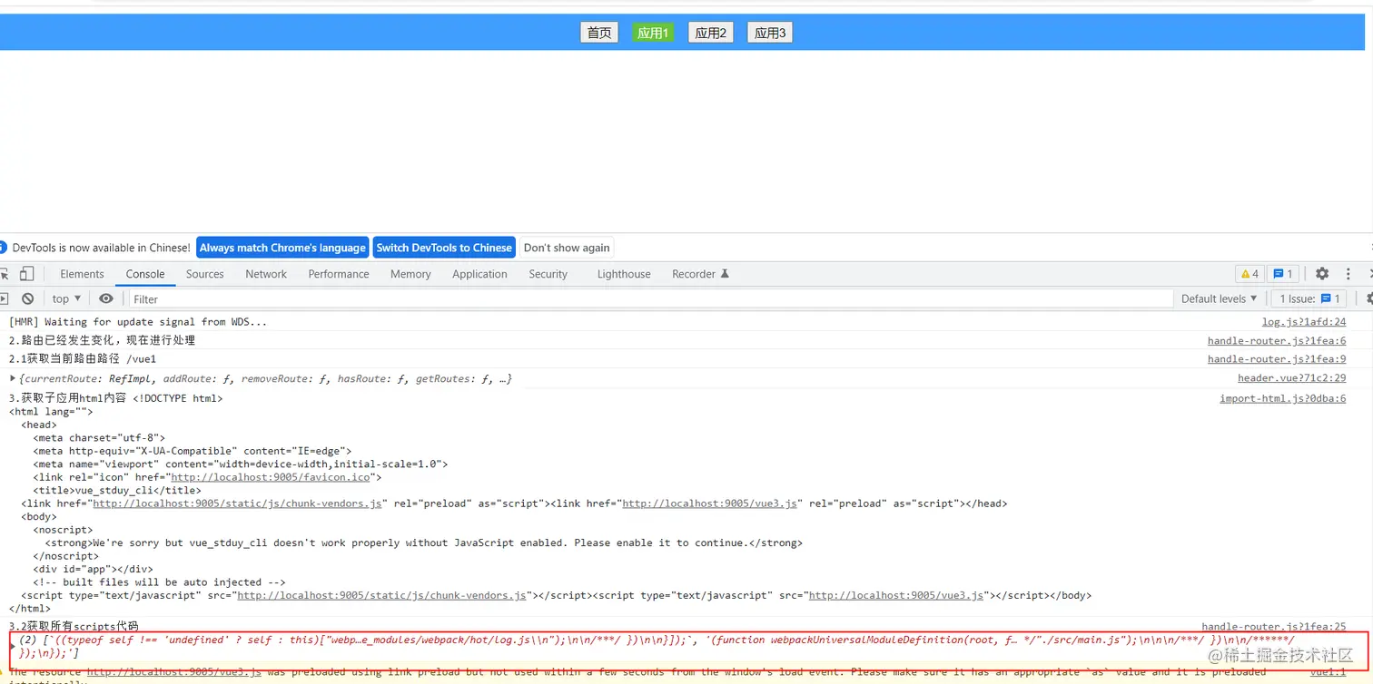 我们可以知道,通过 module.exports 就可以拿到所有的子应用属性。为了代码的简洁性,我们通过execScripts函数把这个对象暴露出去,在handle-router.js中获取这个值
