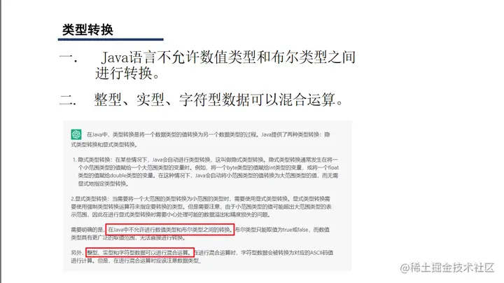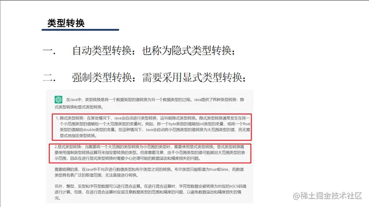 在Java中,类型转换是将一个数据类型转换为另一个数据类型的过程。类型转换分为两种:隐式类型转换(自动类型转换)和显式类型转换(强制类型转换)。