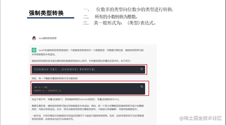 在这个例子中,将double类型的变量x强制转换为int类型的变量y。由于int类型的范围比double类型的范围更小,所以在进行强制转换时,小数部分将被截断,可能导致数据丢失。