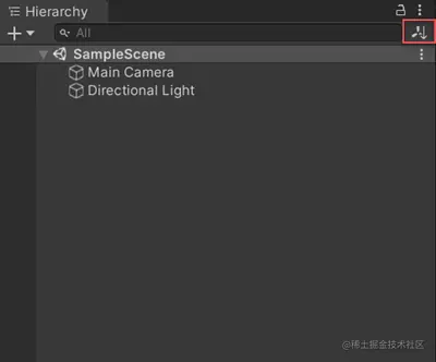选择后,一个图标会出现在 Hierarchy 窗口中,允许在 Transform 排序(默认值)或 Alphabetical 排序之间切换。