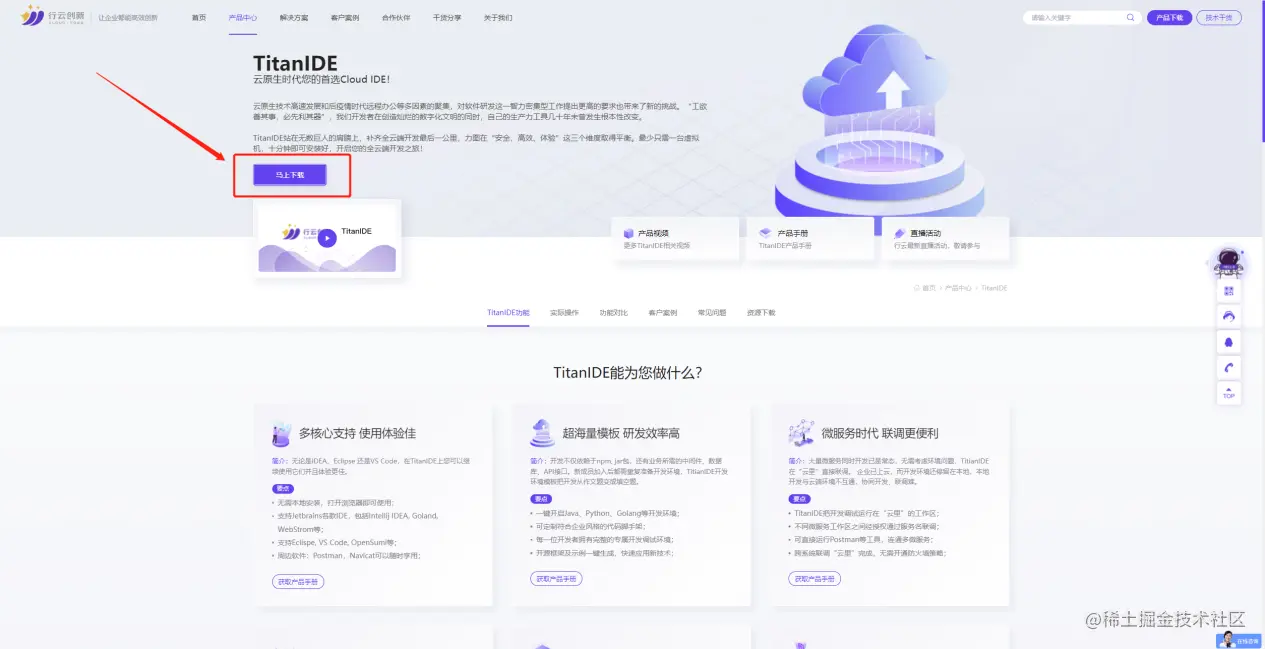 1、找到我们官网(www.cloudtogo.cn),点击“产品中心”-> TitanIDE-> 点击“马上下载”