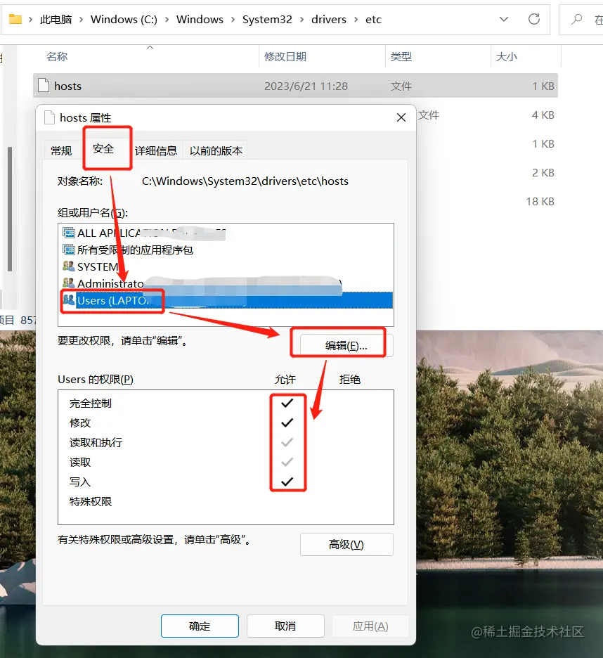 ①右键 hosts文件,点击属性-> 安全-> 选择Users -> 编辑-> 除了特殊权限,其他都✔ ->确定
