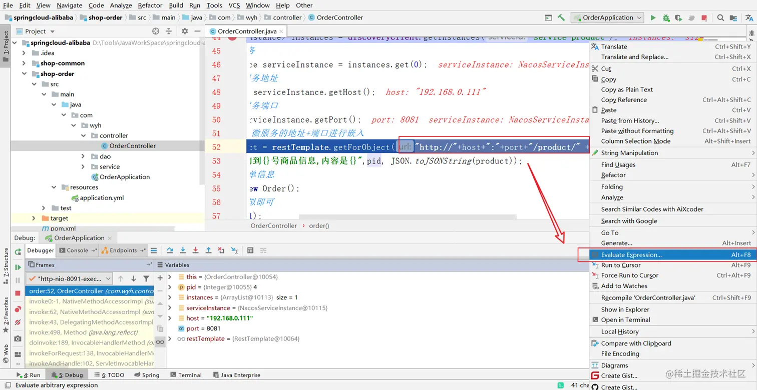 最后处理订单微服务通过nacos来获取商品微服务的地址,通过注入DiscoveryClient 获取某个具体微服务的信息