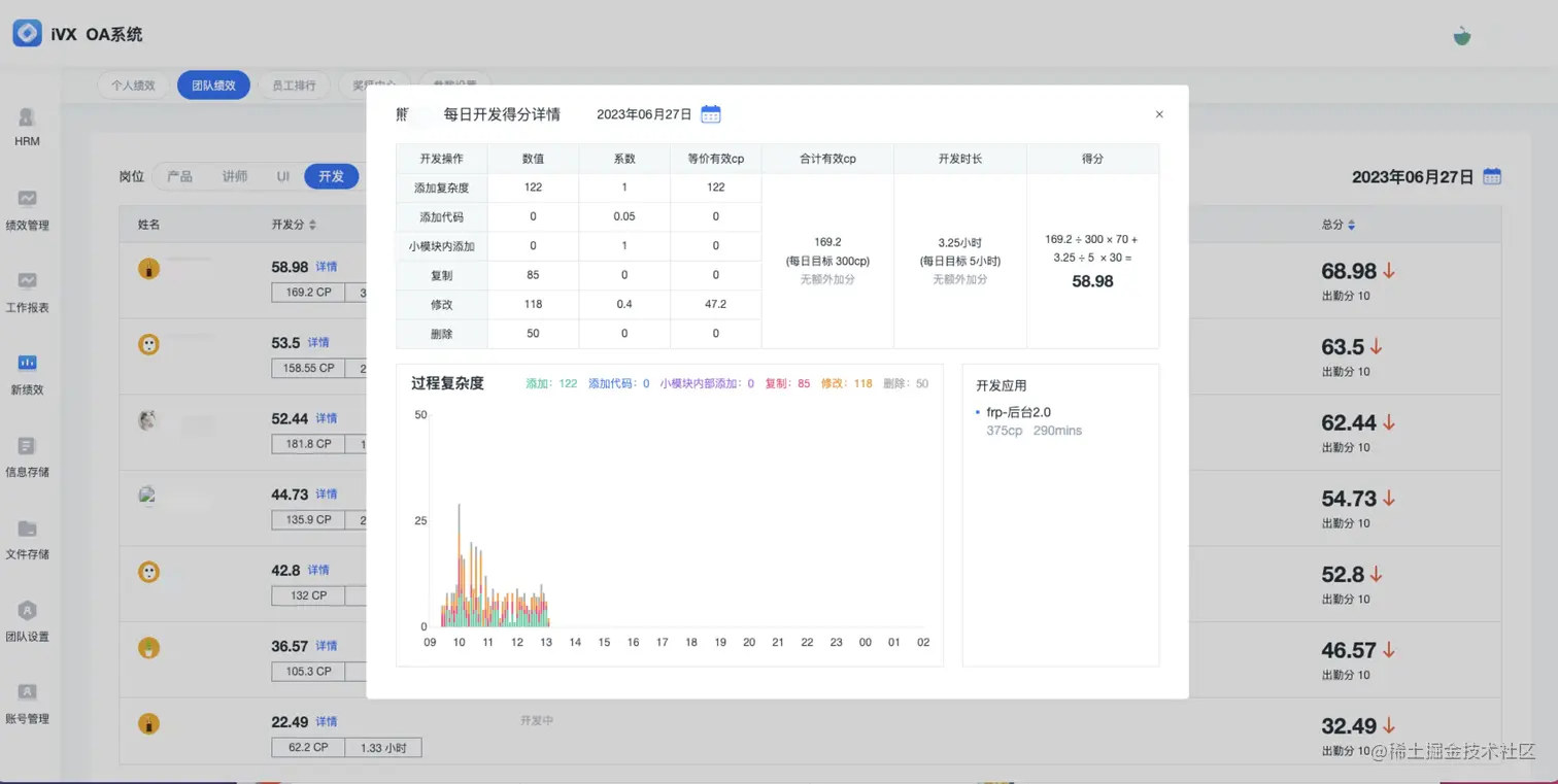 该系统,可以统计每个开发者每5分钟输出的“复杂度”和“开发时长”;复杂度可以理解为在iVX IDE上的有效操作,甚至会标记出“哪些是自己编辑的,哪些是Copy的,哪些是修改的,哪些是代码形态的”。可以非常容易量化出开发人员的工作状态和实际产出,对研发管理有很大帮助。