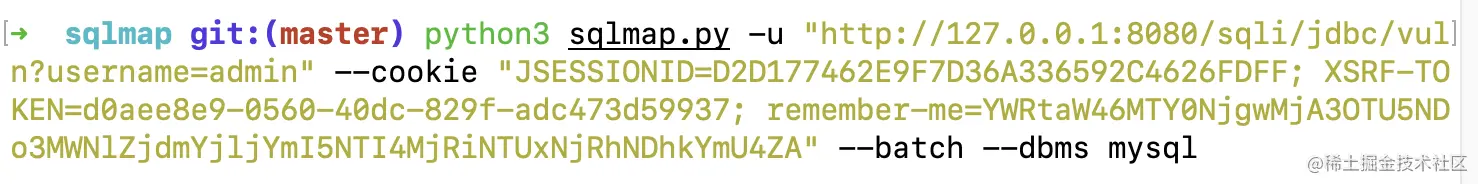 其中—cookie用于指定cookie,—batch 自动化执行,—dbms指定数据库类型