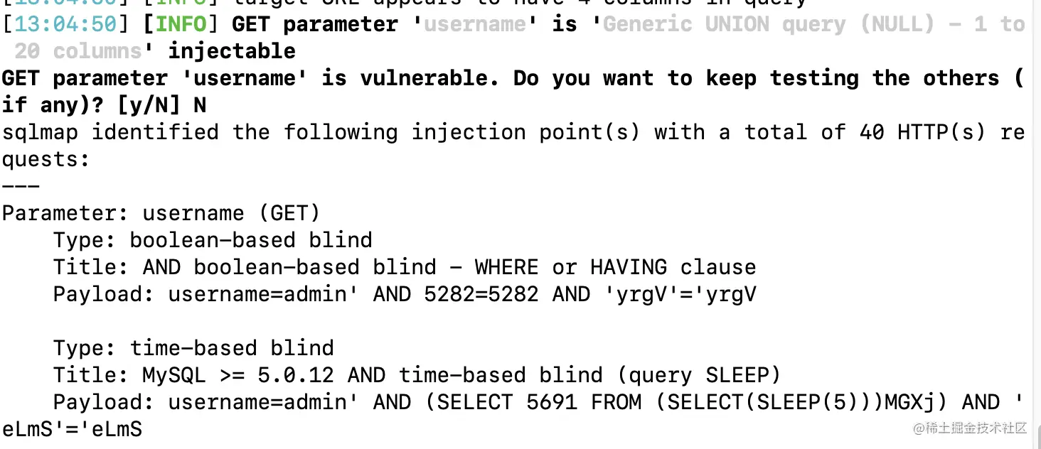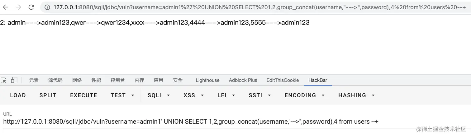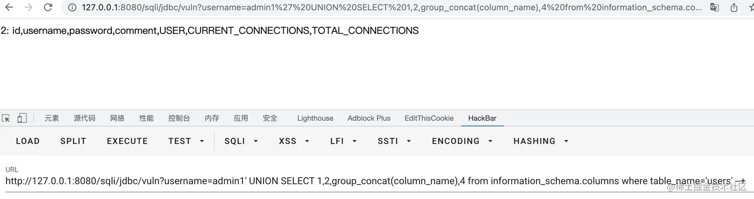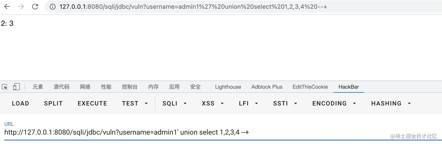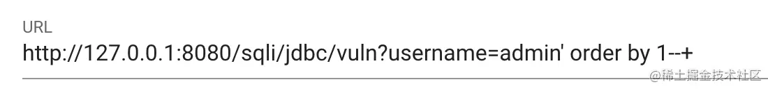 此处我们将原本username的值admin替换为admin’ order by 1 —+,其中admin后的单引号用于闭合原本sql语句中的前引号,—+用于注释sql语句中的后引号。—后的+号主要作用是提供一个空格,sql语句单行注释后需有空格,+会被解码为空格。