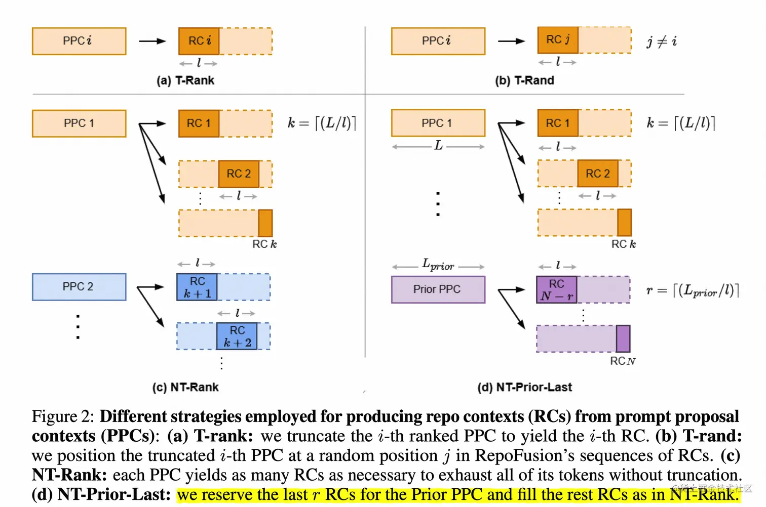 - Not Truncated-Prior-Last (NT-Prior-Last)。与NT-Rank相同,只是prior PPC始终按顺序放置在末尾。由于解码器按照输入的顺序关注存储库上下文的连接编码表示,因此这种策略有助于我们理解从prior PPC的编码表示继续代码生成的作用,因为它是解码器中最近关注的表示。请注意,根据N的值,可能需要删除某些排名靠前的PPC的部分块,以容纳位于末尾的prior PPC。