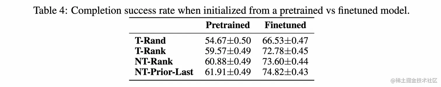 - 对CodeT5使用Next Token Prediction进行Fine-tune很重要。表4展示了使用预训练的CodeT5-base模型初始化与使用微调版本进行初始化进行训练时,RepoFusion的评估结果。可以看到,使用RC进行训练可以提高基于预训练的CodeT5模型的性能(原始CodeT5性能参见表7)。作者发现,在所有情况下,使用微调的模型进行训练都具有明显的优势。