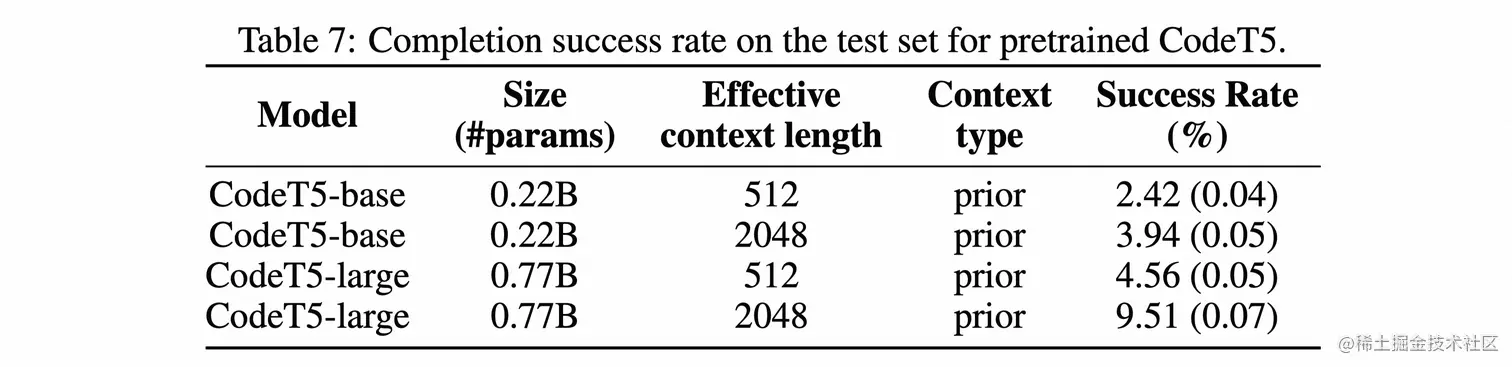 - Model Size和Context Length的增加可以提升Baseline性能。例如,CodeT5-large比CodeT5-base性能更好。采用4096的Context length比2048性能要好;