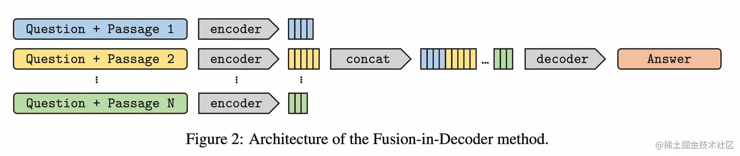 FiD直接将检索回来的每个document都与question通过encoder分别编码,然后concat在一起输入decoder生成最终的输出。