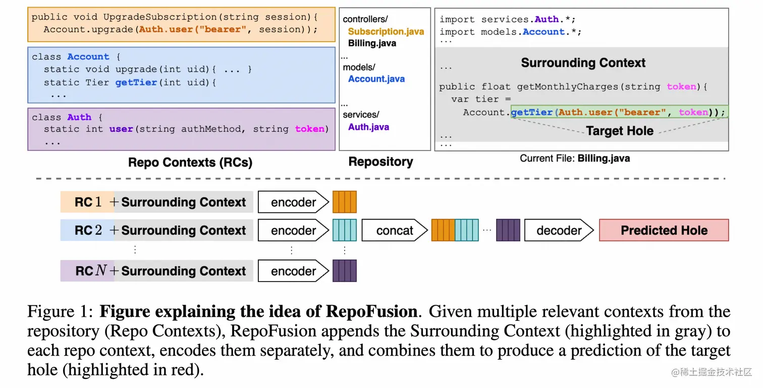 现如今大型语言模型(LLMs)在编码助手中变得越来越受欢迎,但是它们往往难以理解代码存储库中的上下文,并因此会产生不准确的代码完成。为了解决这一问题,该论文提出了一个叫做RepoFusion的框架,以在模型训练中整合相关的存储库上下文。实验表明,使用存储库上下文训练的模型性能明显优于其他较大的代码模型。此外,该论文还发布了一个包含Java存储库的数据集,并提供了代码和训练好的检查点。在具体实现方面,论文使用了Fusion-in-Decoder架构来将存储库上下文(Repo Context,RC)组合起来,以生成更准确和上下文感知的代码完成。下图1展示了1个例子,其中补全任务就是根据Surrounding Context来预测Target Hole。
