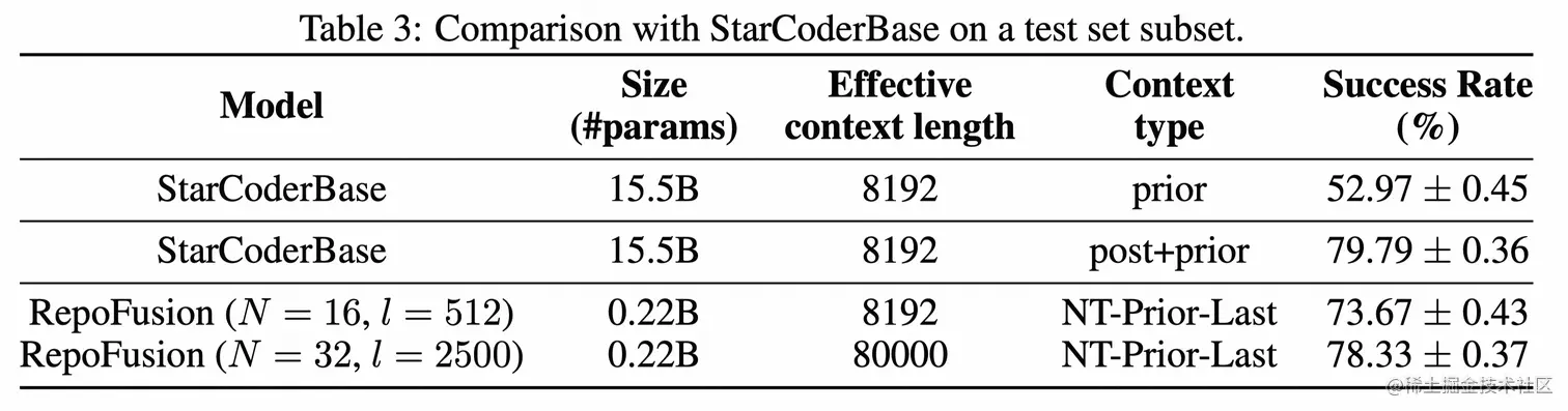 - RepoFusion是有效的。RepoFusion在相同的有效上下文长度下超越了其他更大的模型,即使被限制使用较少的存储库上下文也比其它模型表现更好。当提供额外的存储库上下文时,RepoFusion的性能还有进一步提升。与StarCoderBase模型相比,RepoFusion的成功率仅略低。