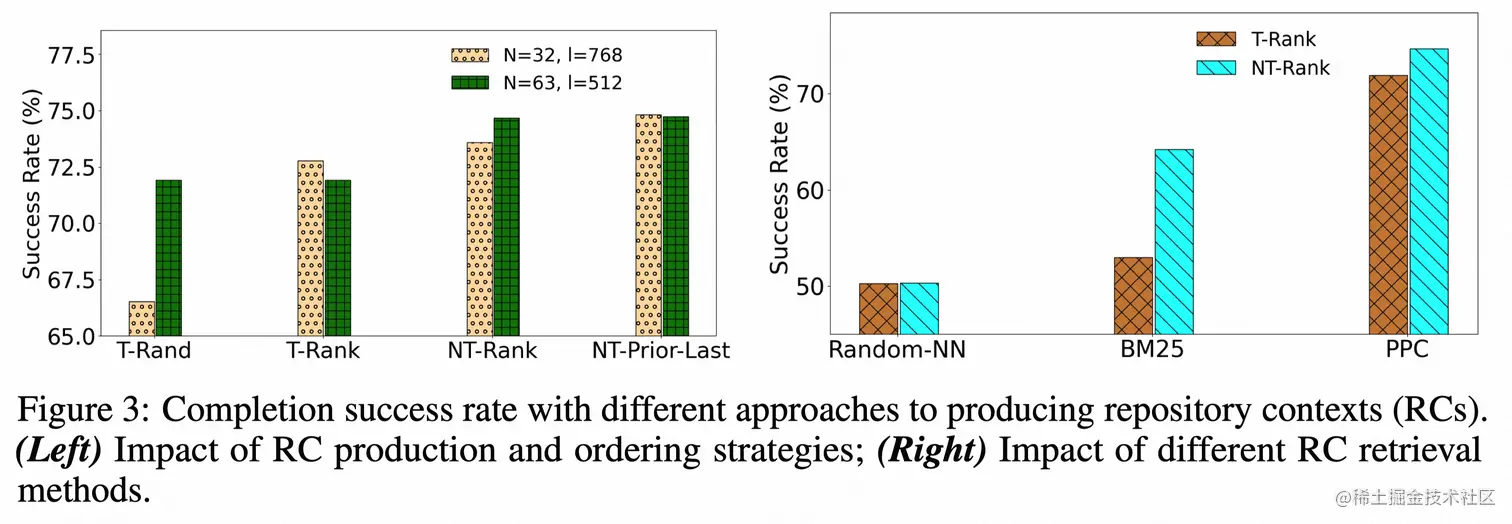 - Prompt Proposal很重要。图3右侧说明在使用T-Rank和NT-Rank时,RepoFusion使用Random-NN、BM25和PPC的SR。结果表明,使用PPC的RC效果最好。