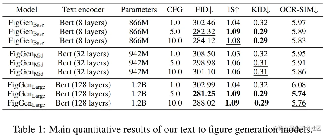 下表 1 展示了不同文本编码器的结果。可见,大型文本编码器产生了最好的定性结果,并且可以通过增加 CFG 的规模来改进条件生成。虽然定性样本没有足够的质量来解决问题,但 FigGen 已经掌握了文本和图像之间的关系。