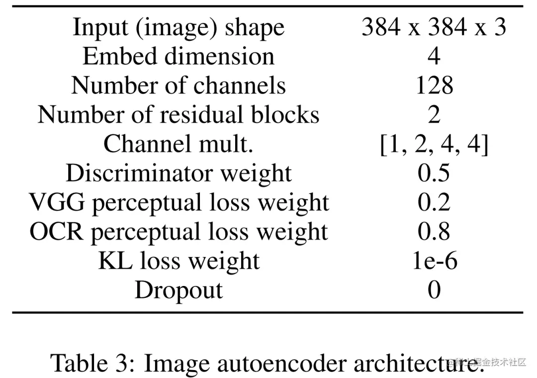 首先学习一个图像自动编码器,用来将图像映射为压缩的潜在表示。图像编码器使用 KL 损失和 OCR 感知损失。调节所用的文本编码器在该扩散模型的训练中端到端进行学习。下表 3 为图像自动编码器架构的详细参数。