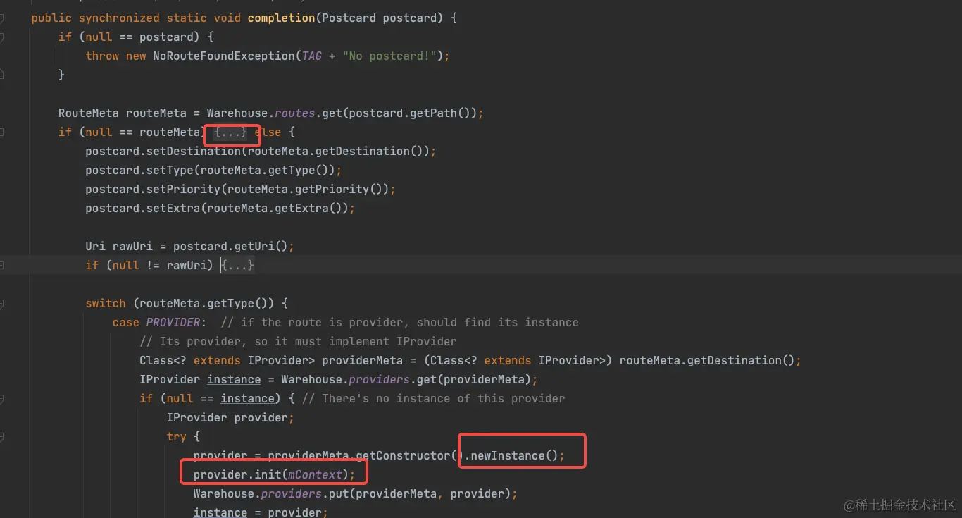 而在运行时以获取Service实例为例,当调用navigation函数获取实例最终会调用到 completion函数。